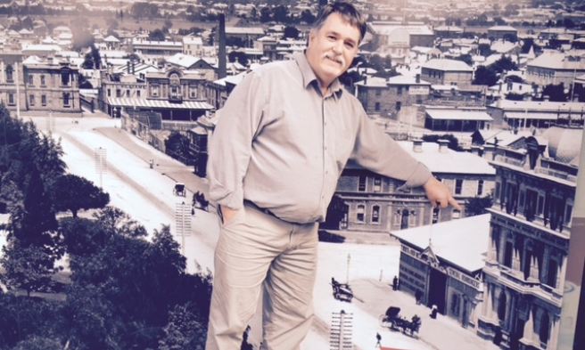 Peter Veld of Kwik Kopy Franklin Street Adelaide points to the building that moved on Victoria Square - Take a look at the window of Kwik Kopy on the corner of Franklin Street and Victoria Square then walk down Victoria Square to Grote Street to see the building that moved 34 metres. -