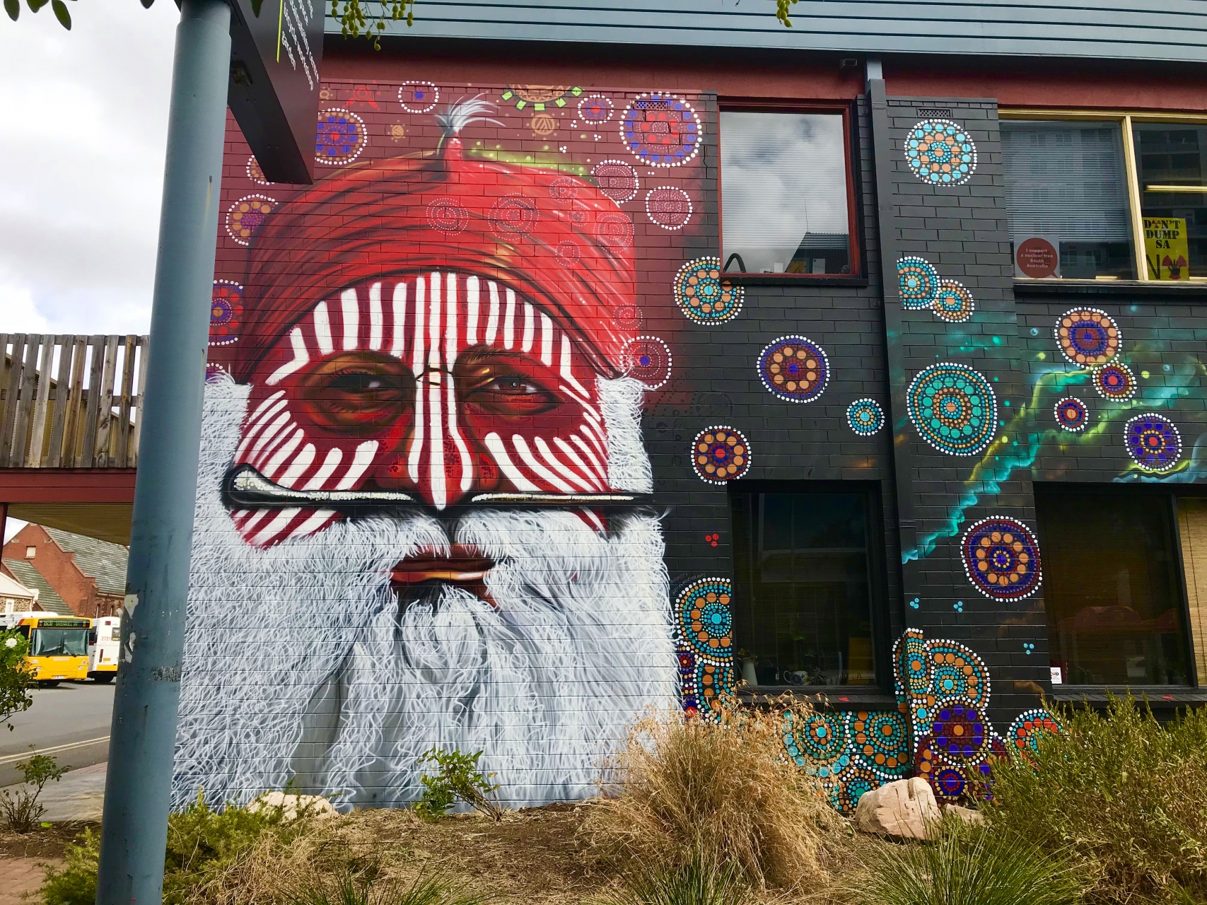 Adjacent to the Bus Station, artists Elizabth Closearts and Kay Miss offer respect to the Kauma people on whose land the facility sits.